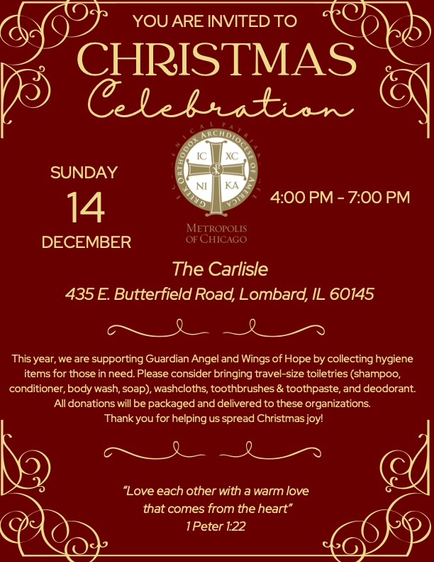 KITS OF HOPE will provide people in need with essential hygiene items this Christmas season. They will be assembled and distributed by the Metropolis of Chicago. How can you help? Bring travel-size toiletries to our collection box at the Ascension, and Philoptochos will take it from there! Read the flyer for details—and thank you for providing basic comfort this Christmas!