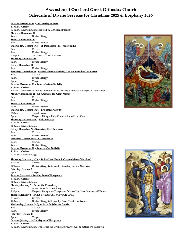 The Ascension of Our Lord Parish Family wishes you and your loved ones a peaceful, spiritual and blessed Nativity & Epiphany season. During the Christmas Fast, may we remain focused on Christ's birth through increased prayer, Holy Communion, confession and fasting. May our hearts become another Bethlehem so that Christ will dwell within us!