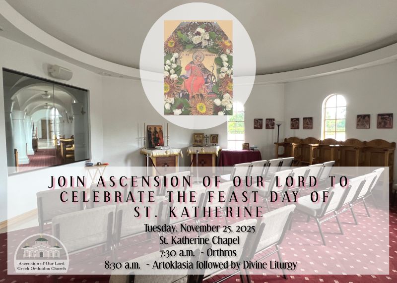THE FEAST OF ST. KATHERINE, which takes place on November 25, is a very special Feast Day for us at Ascension since in 2019, our chapel was dedicated to, and named after this great Saint. On Tuesday, November 25th, we will celebrate Orthros (7:30 a.m.), Artoklasia and Divine Liturgy (8:30 a.m.) - note time change - in our chapel to honor this Saint, venerate her Holy icon, and pray for St. Katherine’s intercessions as we approach the Nativity season as a Parish Family. We also have the great blessing of celebrating daily Liturgies during the Nativity Fast in our beautiful chapel. Please join us in prayer.