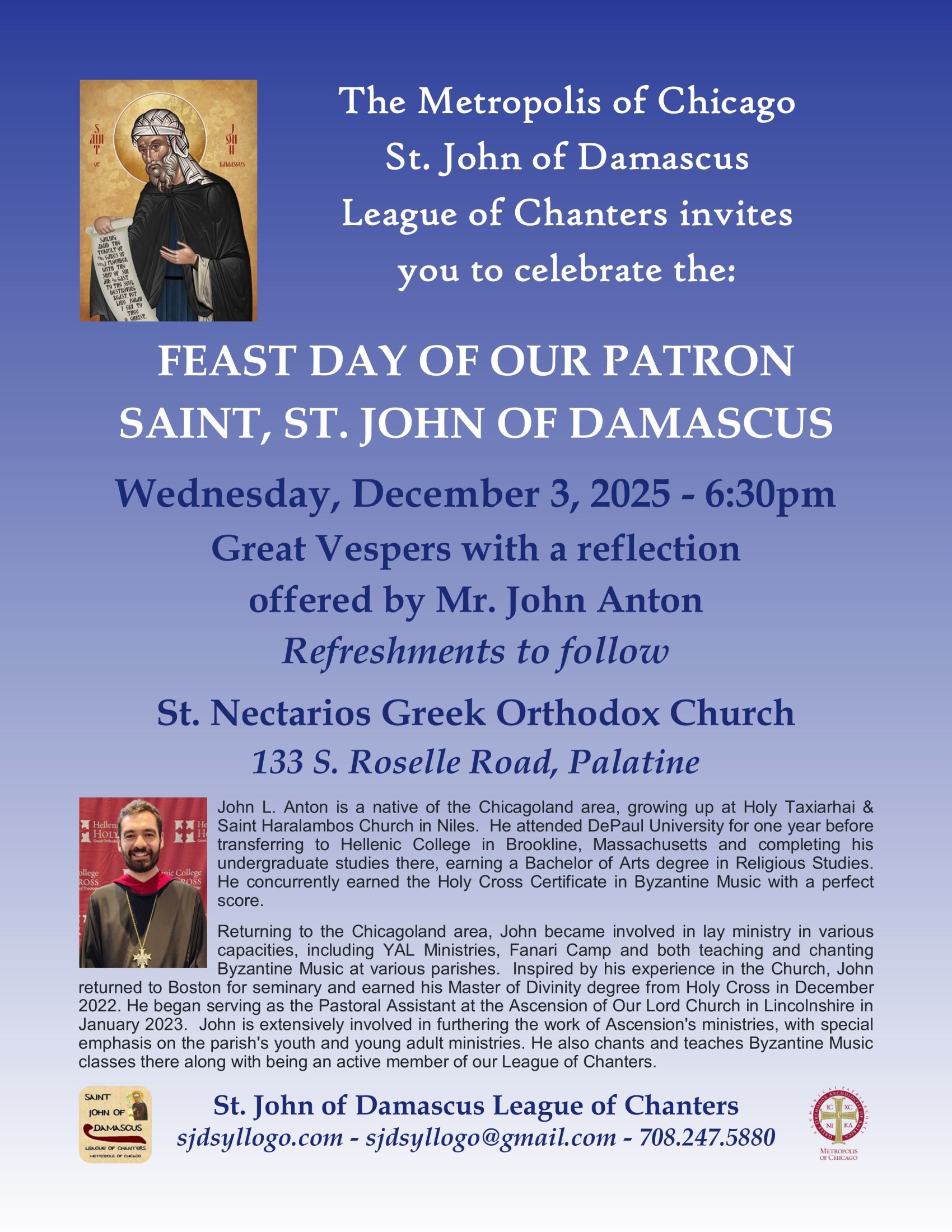 THE ST. JOHN OF DAMASCUS LEAGUE OF CHANTERS invites you to celebrate the Feast Day of their patron saint, St. John of Damascus, on Wednesday, December 3rd. Great Vespers, with a reflection offered by our very own Pastoral Assistant John Anton, will begin at 6:30 p.m. (note time change) at St. Nectarios Church, Palatine. For more information, visit sjdsyllogo.com.