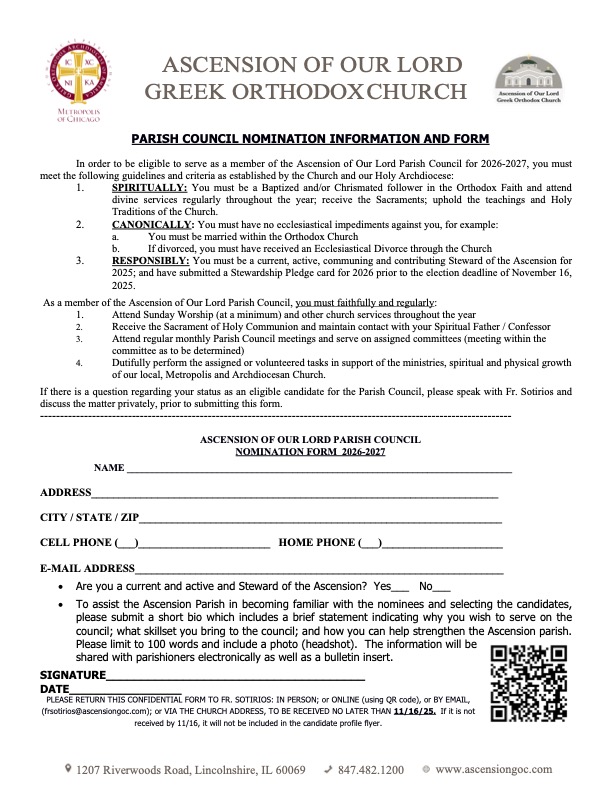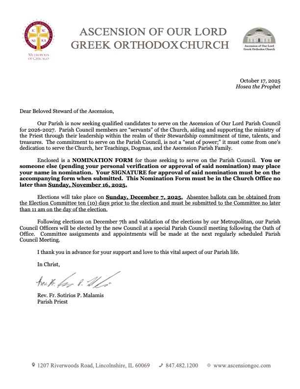 The Ascension of Our Lord Board of Elections invites you to submit nominations for the 2026/27 Parish Council Election. If you or someone you know is a steward in good standing, is living an Orthodox Christian life, and desires to serve Christ and make a difference, please fill out the nomination form either by hardcopy, or online by using the button below (preferred).