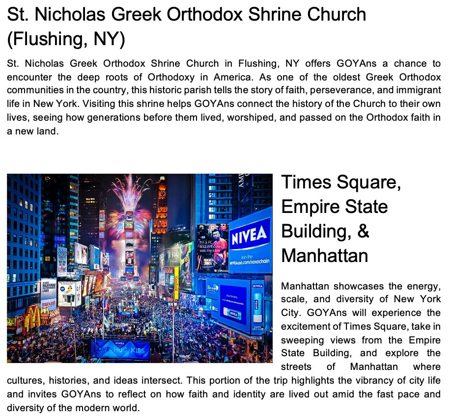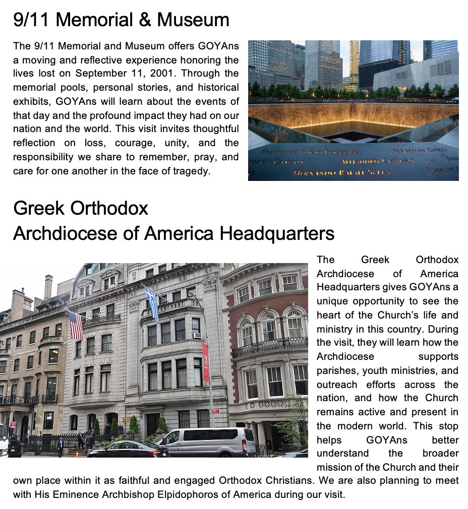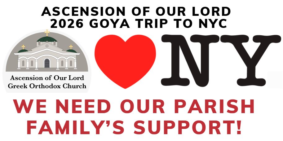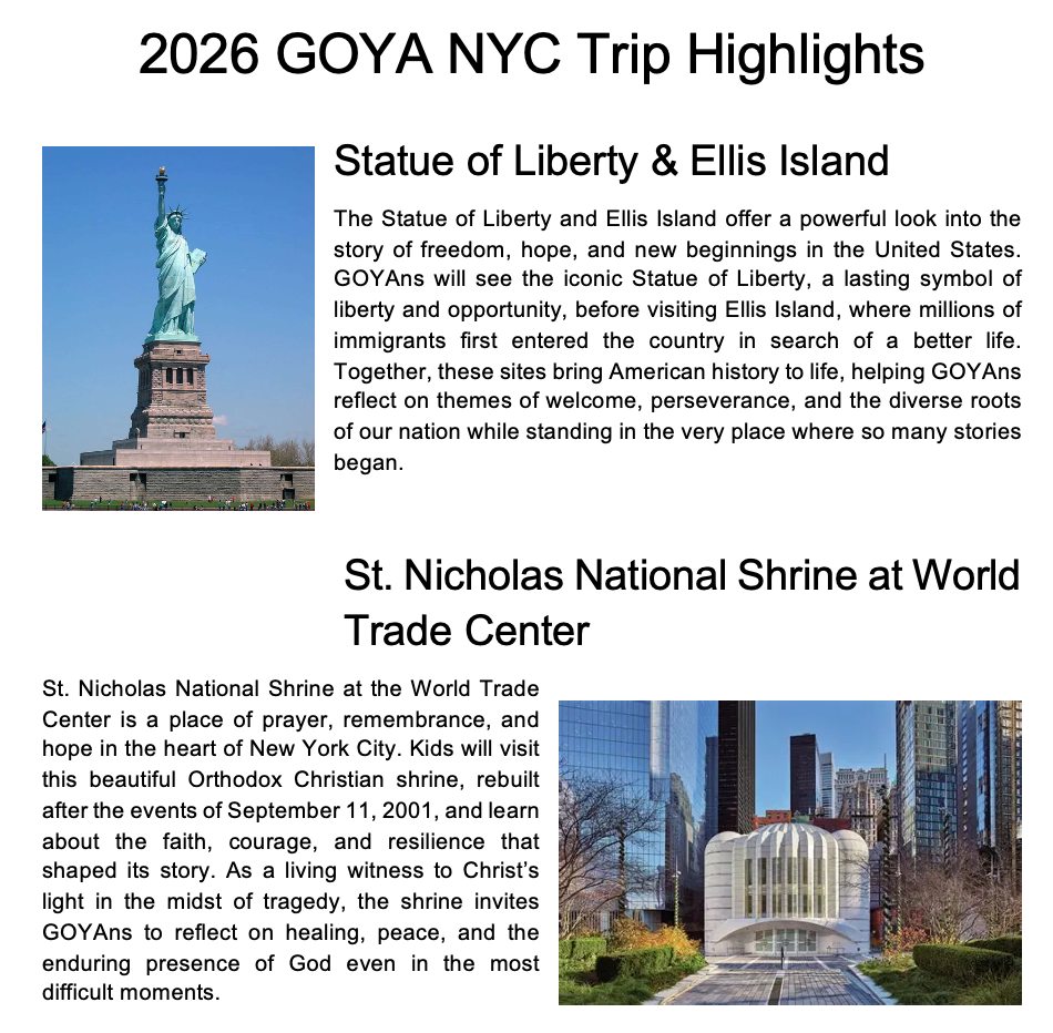 This Spring, our Ascension high school youth will be traveling to New York! Just like former youth group participants who have taken memorable excursions together to places like Boston and New York, our current GOYAns are eagerly awaiting the chance to build lifelong friendships, deepen their spiritual understanding, and explore sites tied to our nation's history and our Greek Orthodox faith in one of America's greatest cities. The trip takes place March 5-8, 2026, and will be a memorable event not only in the lives of our youth, but also in the life of this Parish.