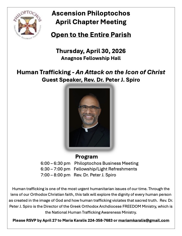 We are also honored to be hosting Fr. Spiro at our April 30 Chapter Meeting, where he will speak on Human Trafficking, one of National Philoptochos’ key initiatives. This is an important and timely topic affecting communities everywhere. Please help spread the word and RSVP to me by April 27.