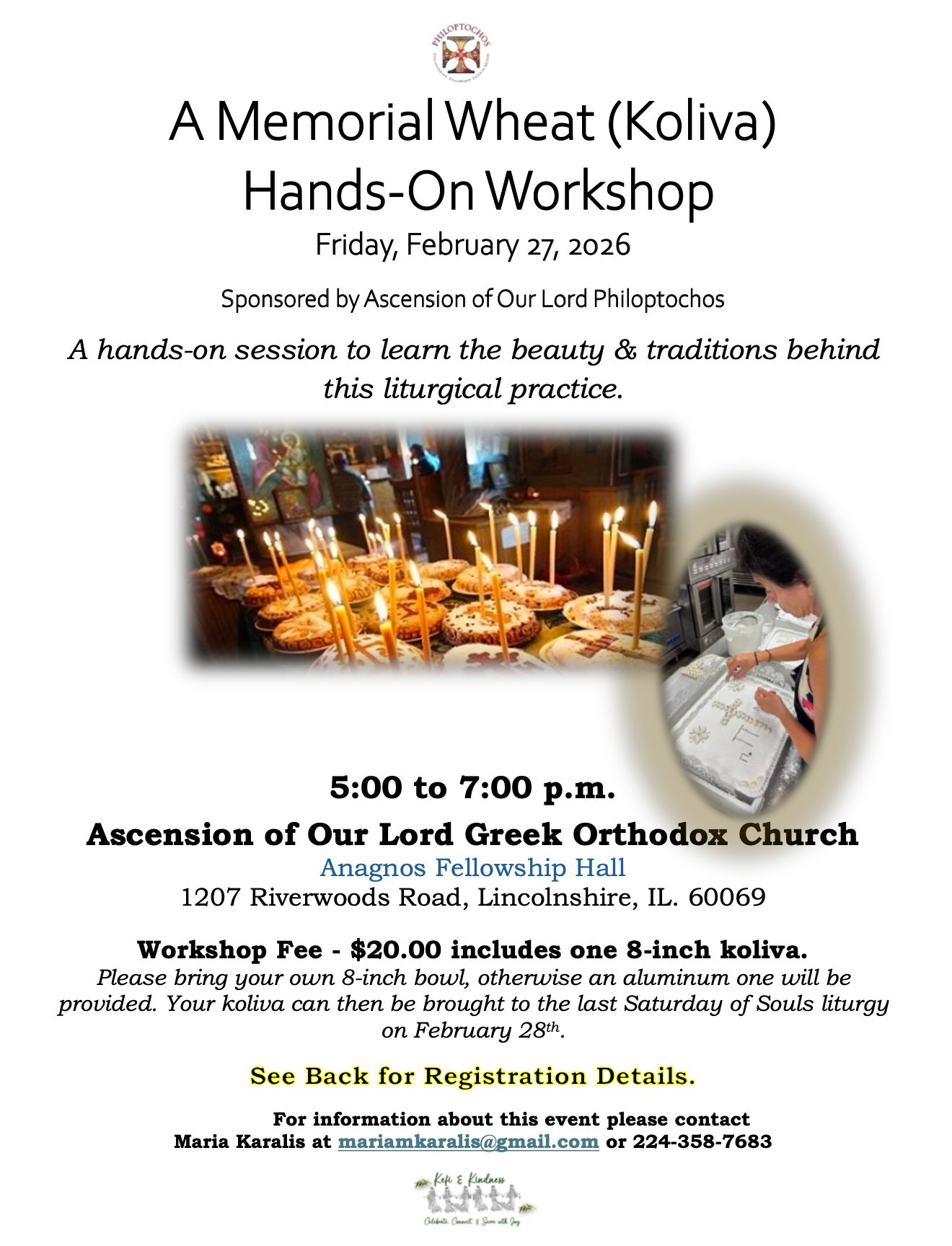 On February 27, we invite you to join us for a hands-on Koliva (memorial wheat) workshop. This meaningful event will guide participants through the tradition of preparing koliva as a way to honor and remember a loved one. Please consider bringing a friend—this workshop is open to all.