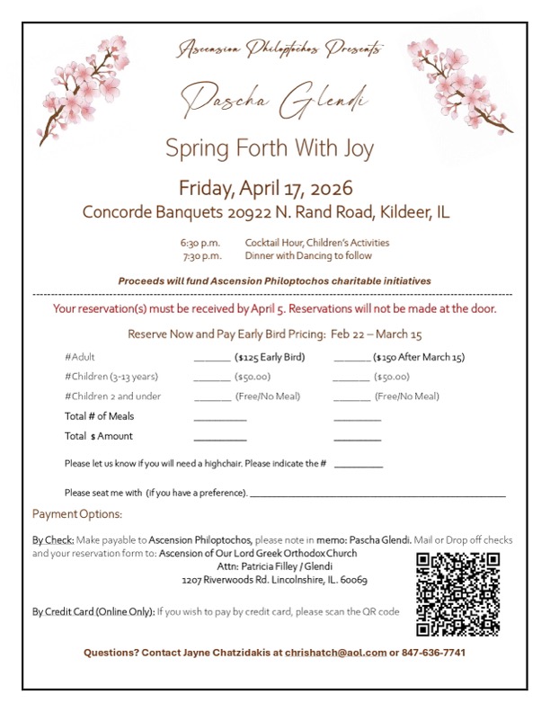 Join us at our first-ever Pascha Glendi: Spring Forth with Joy! Gather your table of friends and family, and take advantage of EARLY-BIRD PRICING beginning February 22nd through March 15! Reserve online or click and print the form above. Looking for fellowship, fun and family activities? We’ll see you on Friday, April 17 at the Concorde! Thank you for supporting Philoptochos’ biggest fundraiser of the year, benefitting our charitable initiatives. Please note: Reservations will not be taken at the door.