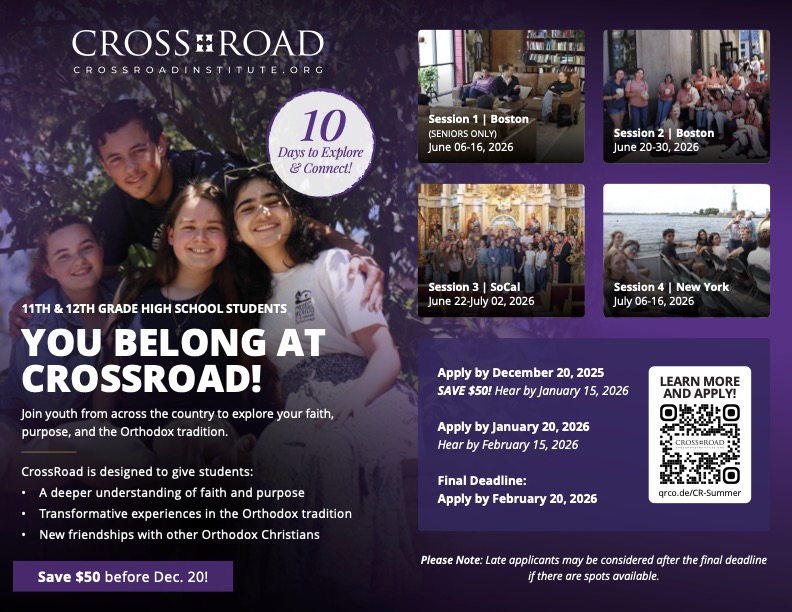 Are you an 11th or 12th grader looking ahead to the summer? Learn more today about the CrossRoad Institute Summer Program, a 10-day academic institute made just for you! Travel to Boston, New York, or Southern California to connect with other Orthodox Christians as you prepare to make big life decisions and start new adventures. Apply by December 10, 2025 to save $50. Learn more at https://crossroadinstitute.org/, or call 617-850-1310 . - SCHOLARSHIP OPPORTUNITIES