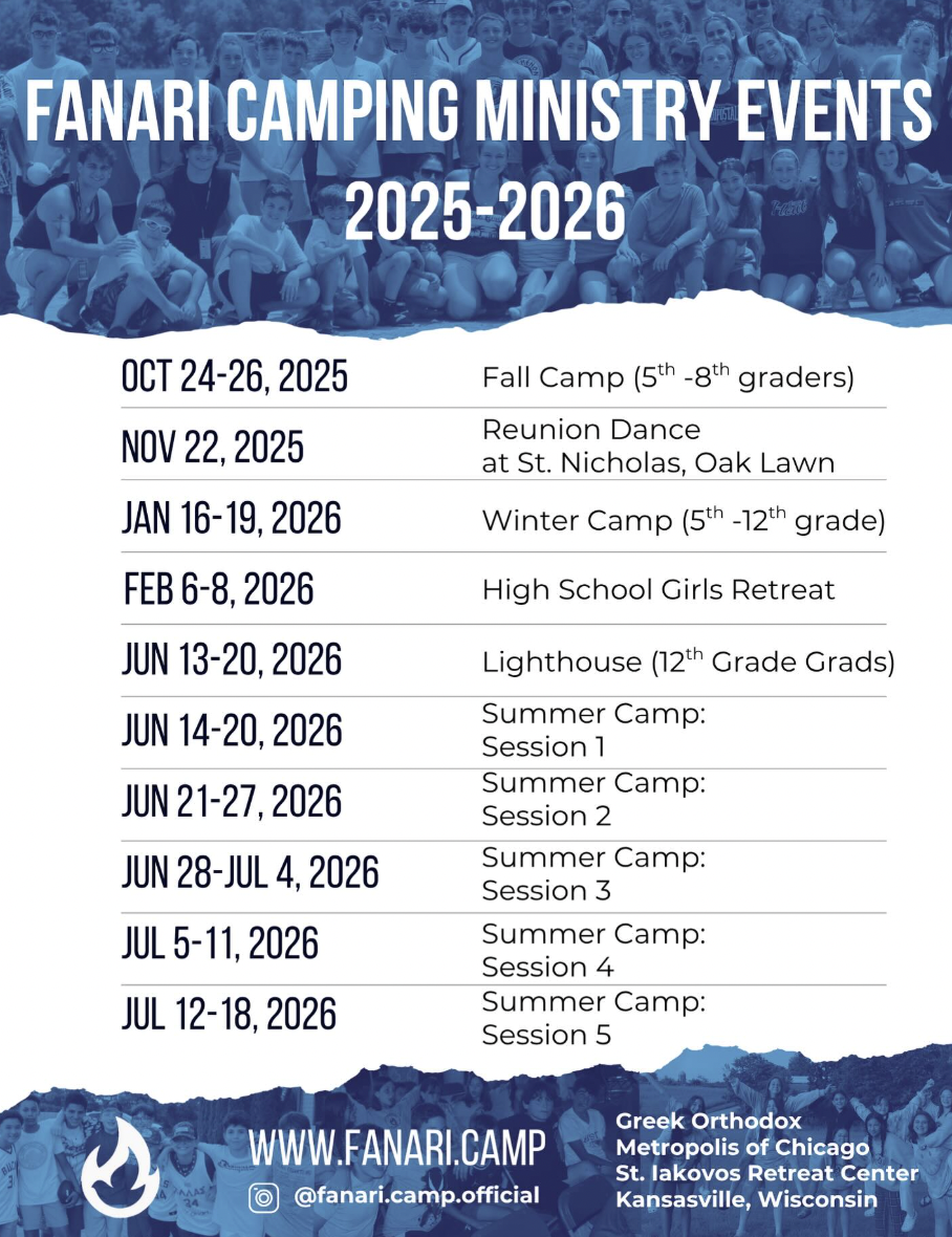 FANARI SUMMER CAMP Fanari Summer Camp is the Metropolis of Chicago summer camping ministry, available for rising 6th grade through rising 12th grade campers. The Summer camp program has four individual sessions each year, running from mid-June through mid-July. Each year, 150-160 campers join each week of Fanari Summer Camp for growth in their faith & friendships, while having a ton of fun along the way. Some of our most enjoyable activities include: Worship, Orthodox Life & Bible Study, Boating & Swimming, Summer Olympics, dances, field trips, and much more! The 2025 Summer Camp Registration opened March 10. More info to come regarding 2026 dates.