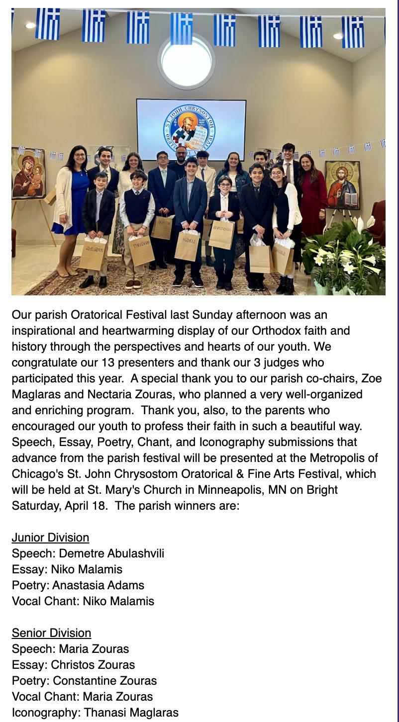 - With the blessings of His Eminence Metropolitan Nathanael, the 42nd Annual Saint John Chrysostom Oratorical and Fine Arts Festival is on Bright Saturday, April 18, 2026 at St. Mary's Greek Orthodox Church, Minneapolis, MN.
